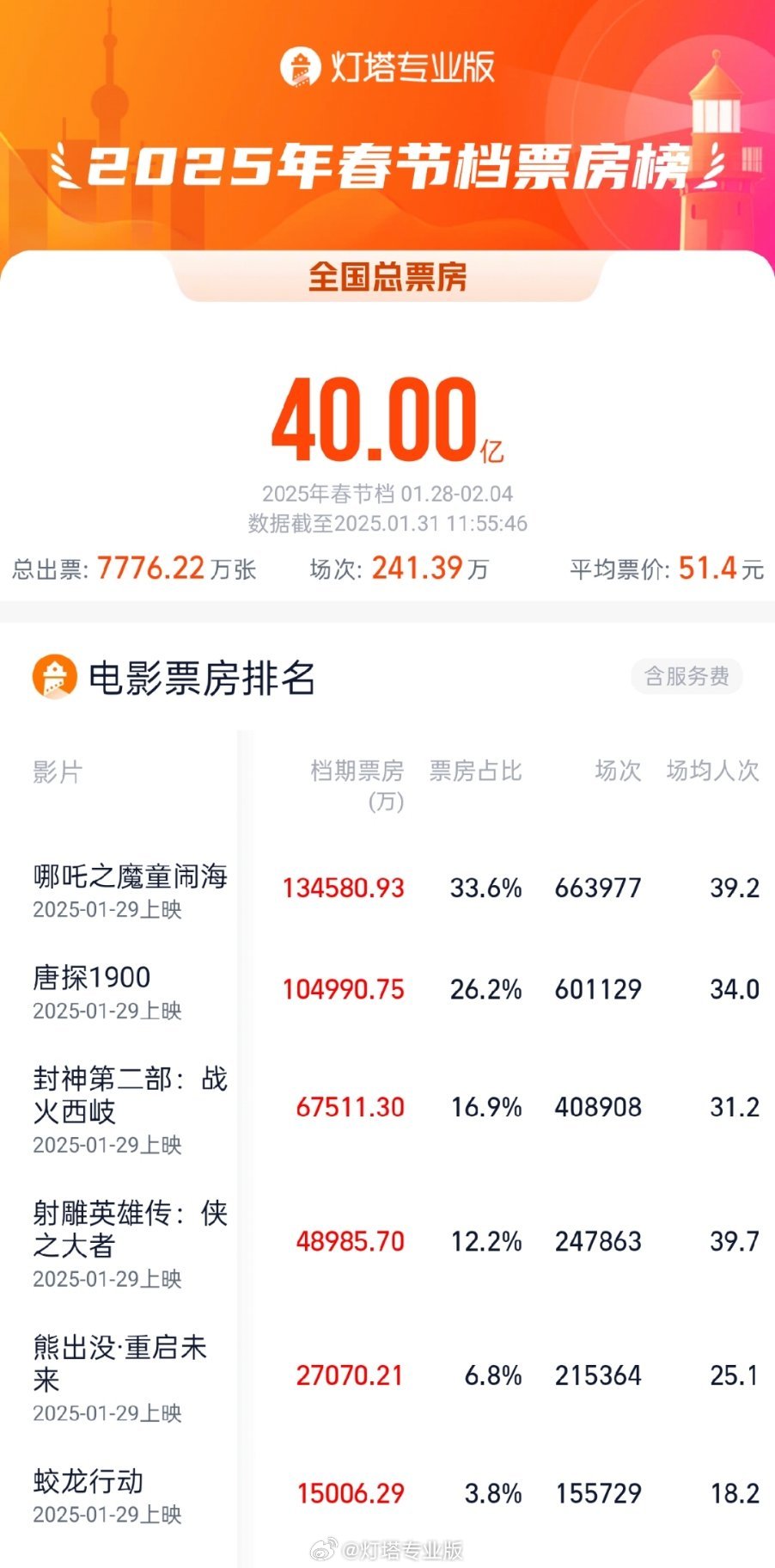 据灯塔专业版,截至1月31日11时55分,2025年春节档(1月28日-2月4日)档期总票房(含预售)突破40亿!