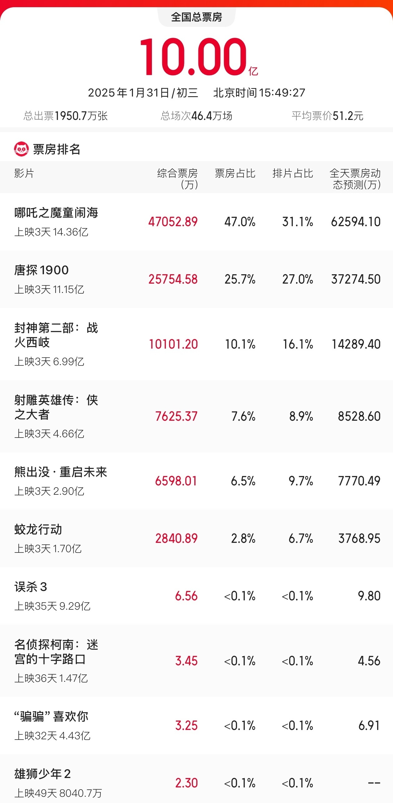 大年初一,共有六部国产新片集中上映,包括《封神第二部:战火西岐》《哪吒之魔童闹海》《唐探1900》《蛟龙行动》《熊出没·重启未来》《射雕英雄传:侠之大者》。