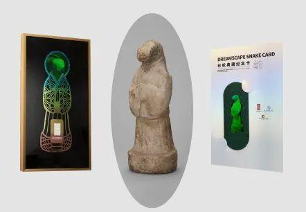 左:《幻彩蛇影》 中:唐石刻十二辰蛇像 右:《巳蛇典藏纪念卡》