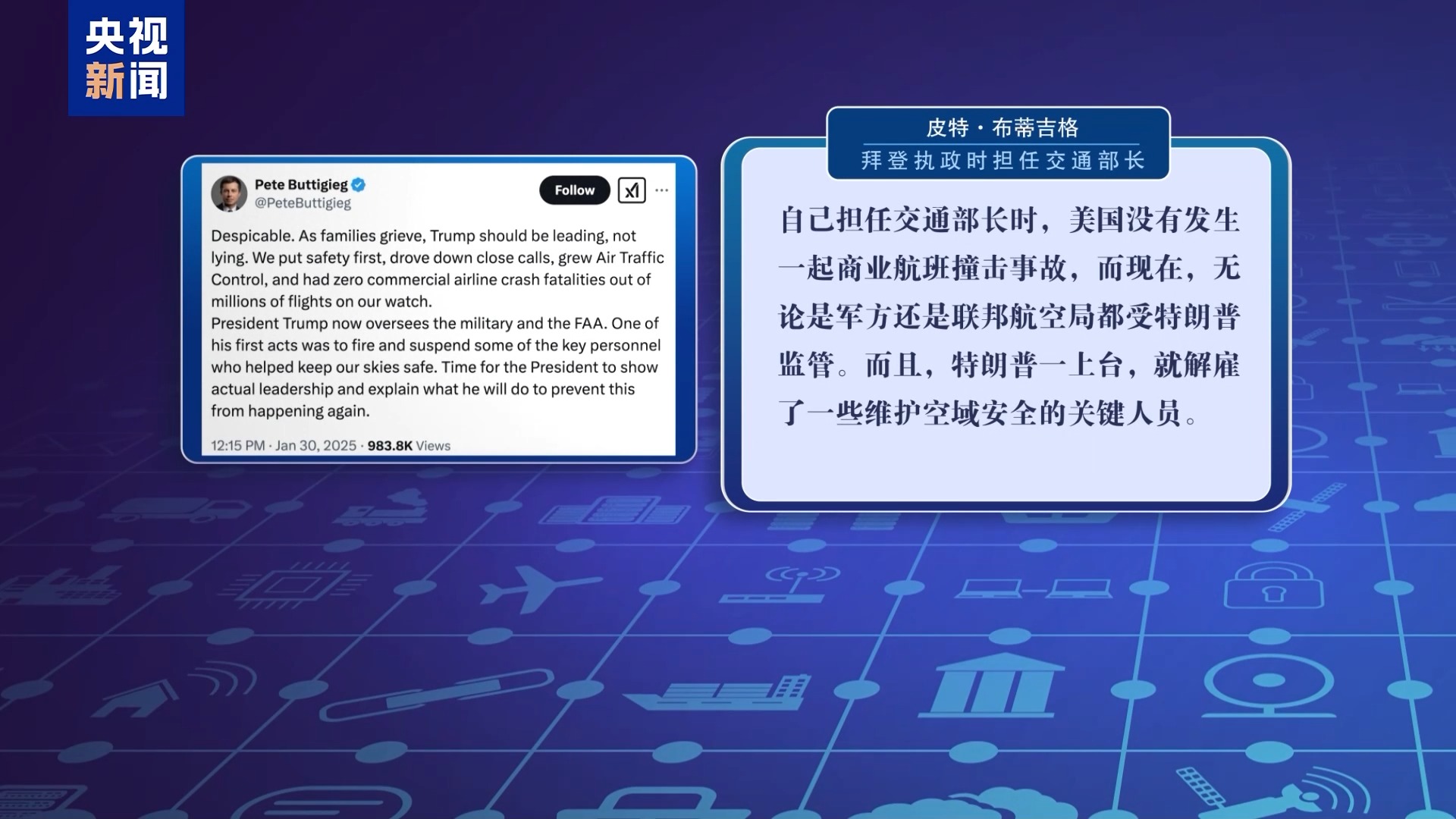特朗普援引联邦航空局的政策称,联邦航空局在空管人员招聘要求里没有对生理和心理疾病的规定。对此,拜登执政时担任交通部长的皮特·布蒂吉格予以否认,说从特朗普首个总统任期开始、即2017年至2021年,相关规定一直都有。布蒂吉格表示,他担任交通部长时,美国没有发生一起商业航班撞击事故,而现在,无论是军方还是联邦航空局都受特朗普监管。而且,特朗普一上台,就解雇了一些维护空域安全的关键人员。