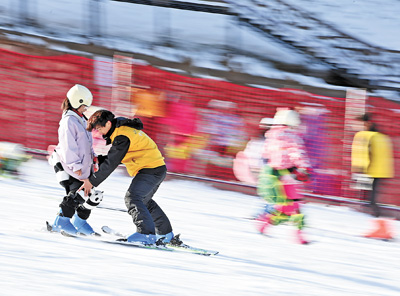 1月30日,游客在安徽金寨县西莲村的莲花山滑雪场感受冰雪运动乐趣。 |