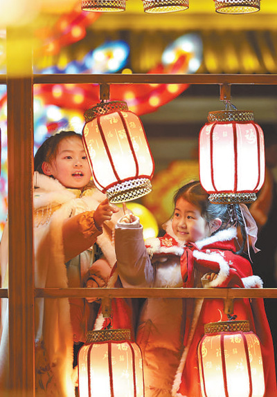 春节期间,山东临沂郯城县郯国古城景区花灯流光溢彩。图为小游客在观赏花灯。 |