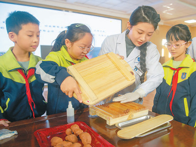 河北省沧州中西医结合医院,中药师(右二)在为小学生演示中药蜜丸的制作工艺。 |