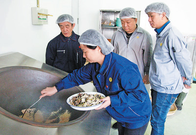 在吕建媛中药炮制技能大师工作室,吕建媛(左二)在演示麸炒枳壳的过程。 |