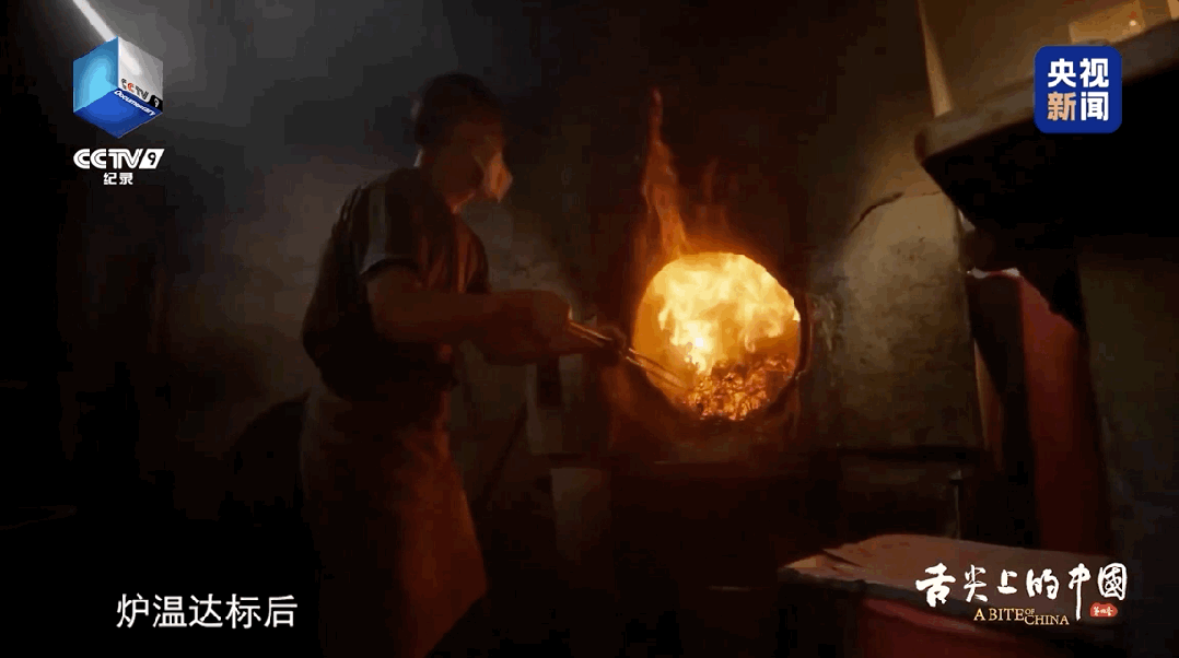 把壁炉里的烧饼贴满,就要开始烘烤烧饼了,把握火候是最关键的一步,由郭金才亲自操作。他拿着麦秸火把,沿炉膛壁慢慢转圈,让烧饼均匀受热。