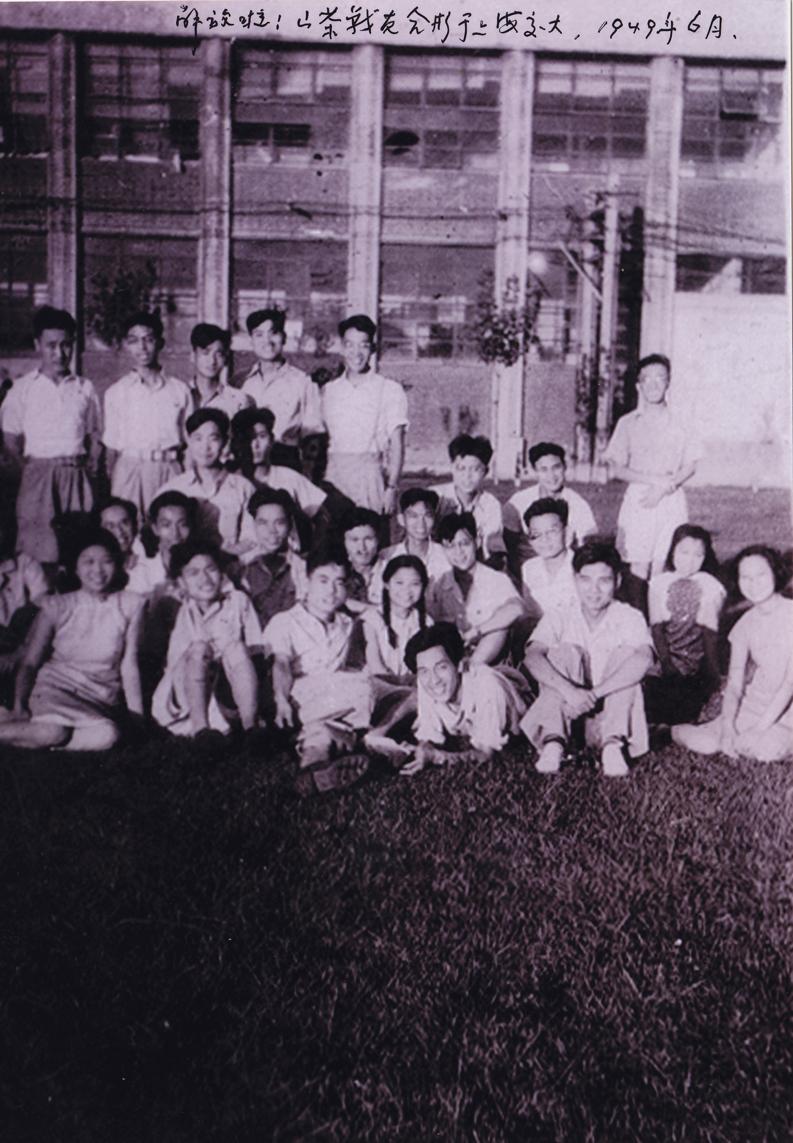 上海解放后,“山茶社”社员在交大校园合影(前排卧者为黄旭华)。