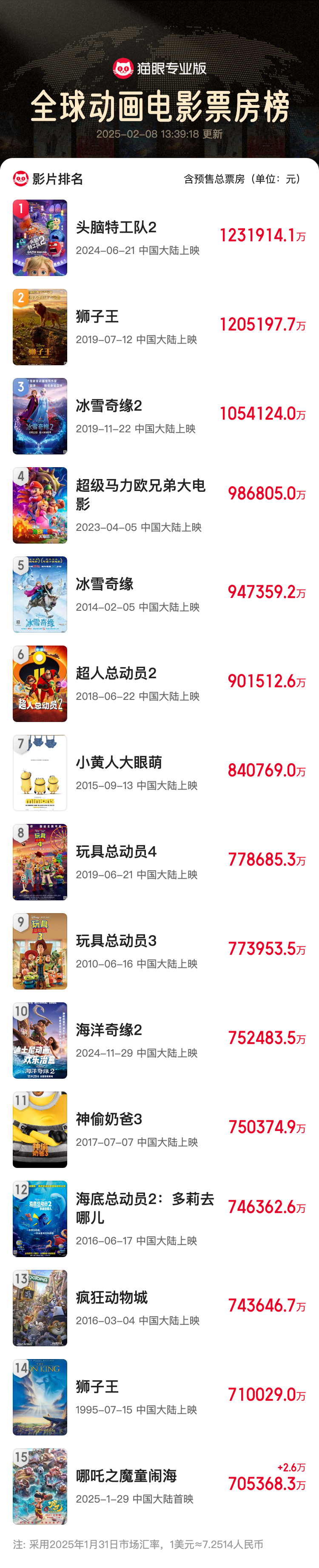 据猫眼专业版数据,电影《哪吒之魔童闹海》累计票房(含预售)超70.53亿,进入全球动画电影票房榜前十五。