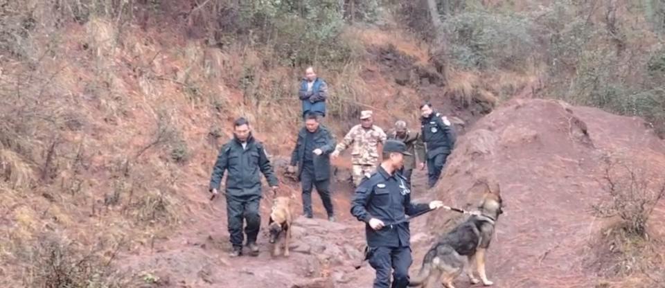 警犬和训导员穿梭于草丛和林间