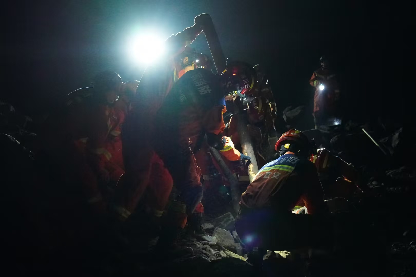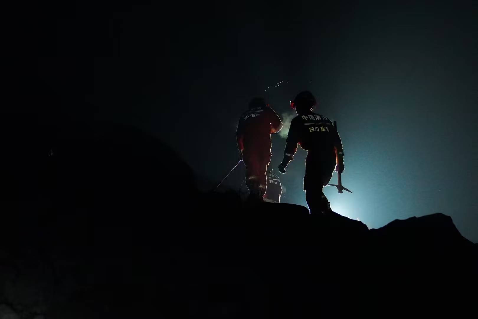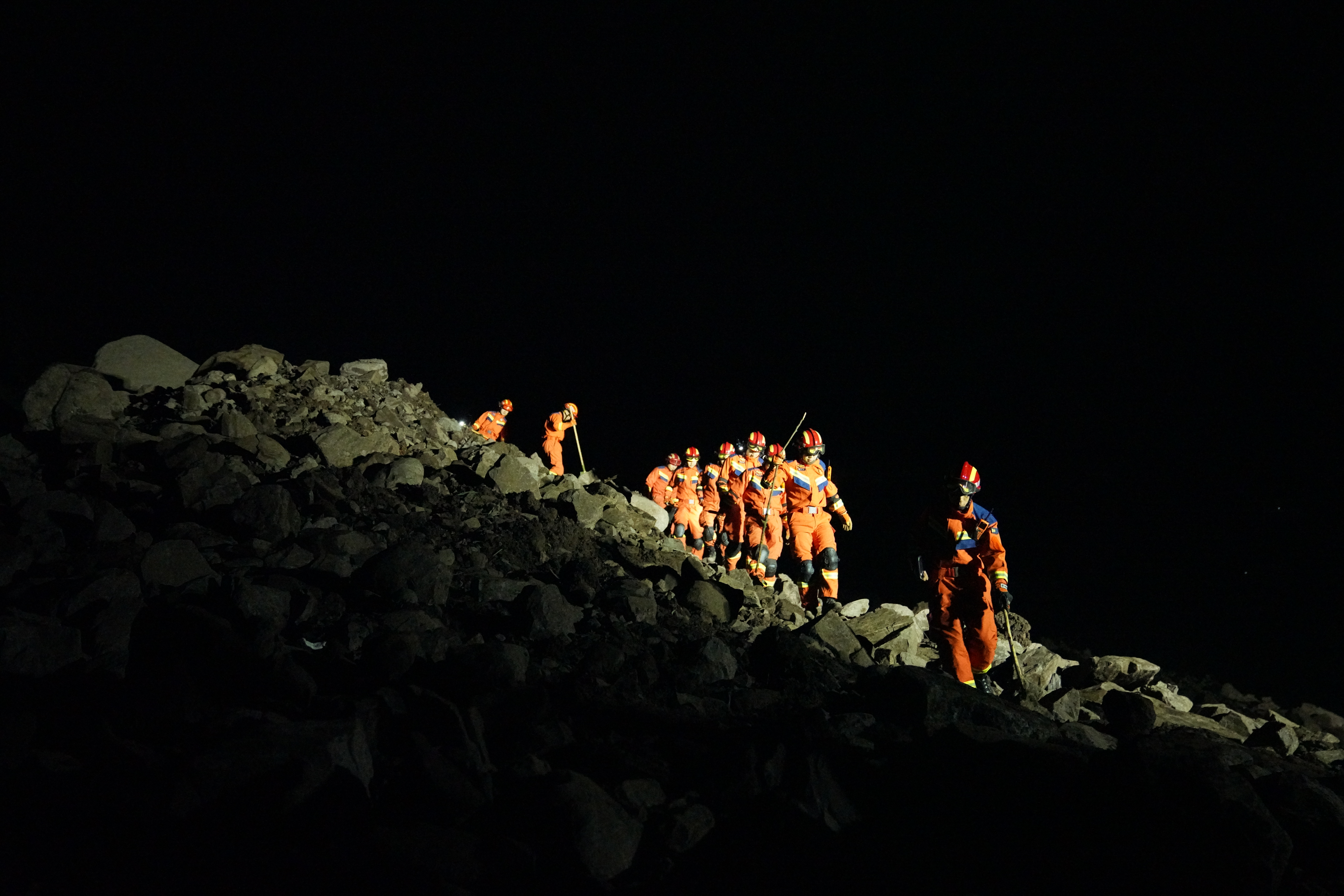 2月8日,四川宜宾筠连县突发山体滑坡。图为2月8日夜,消防救援人员利用搜救犬、生命探测仪从下至上对垮塌废墟进行搜索,对关键点位进行标注后,对废墟现场进行浅表搜救。