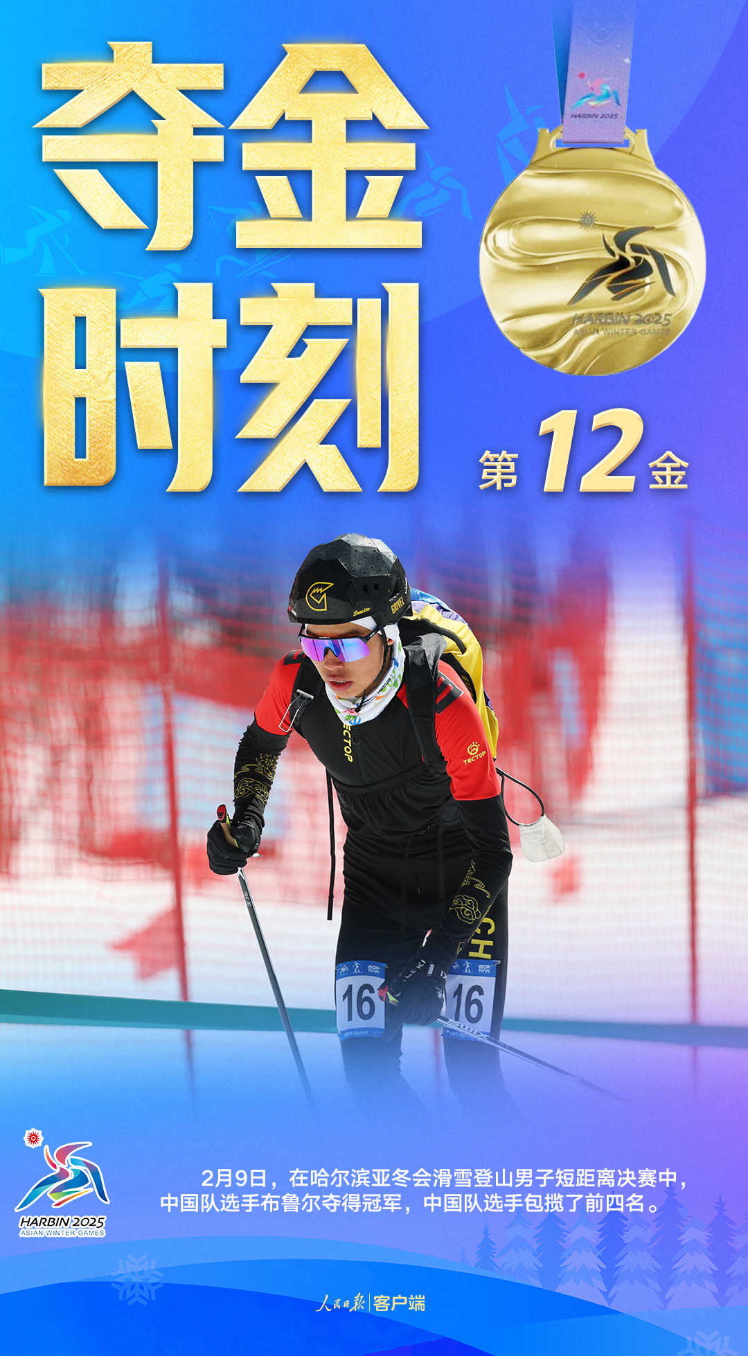 2月9日中午,哈尔滨亚冬会滑雪登山男子短距离决赛中,中国队选手布鲁尔夺得冠军,为中国队赢得了本届亚冬会的第二枚滑雪登山金牌。中国队选手布鲁尔、张成浩、毕禹新、刘建宾包揽前四!恭喜!