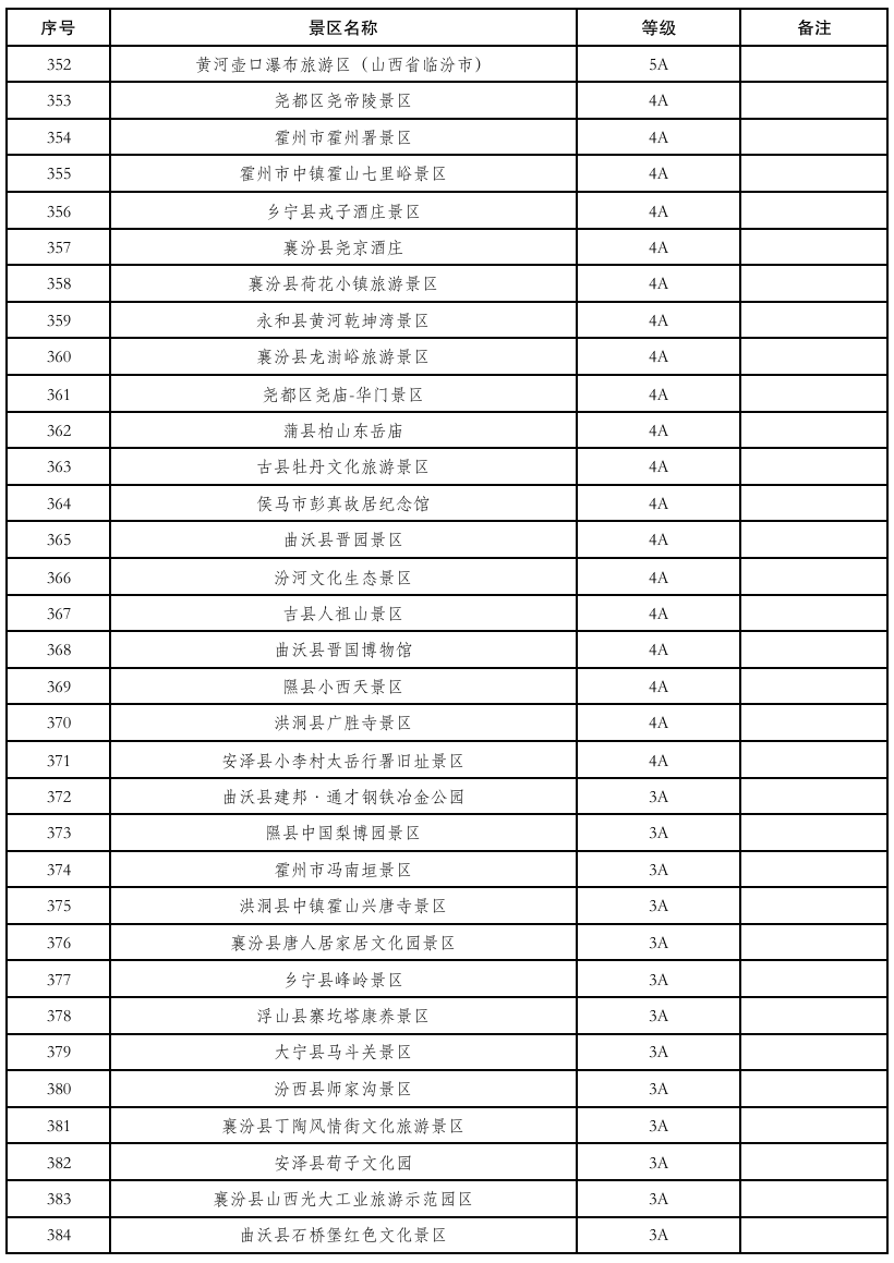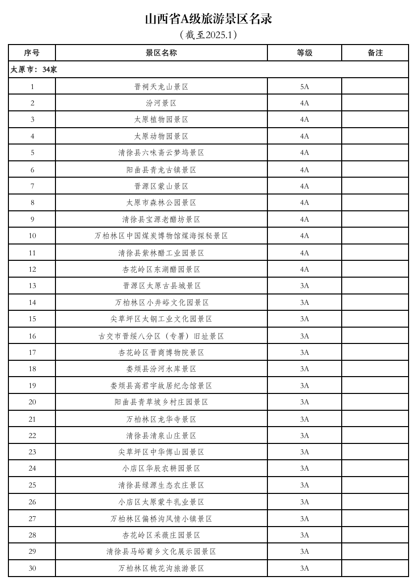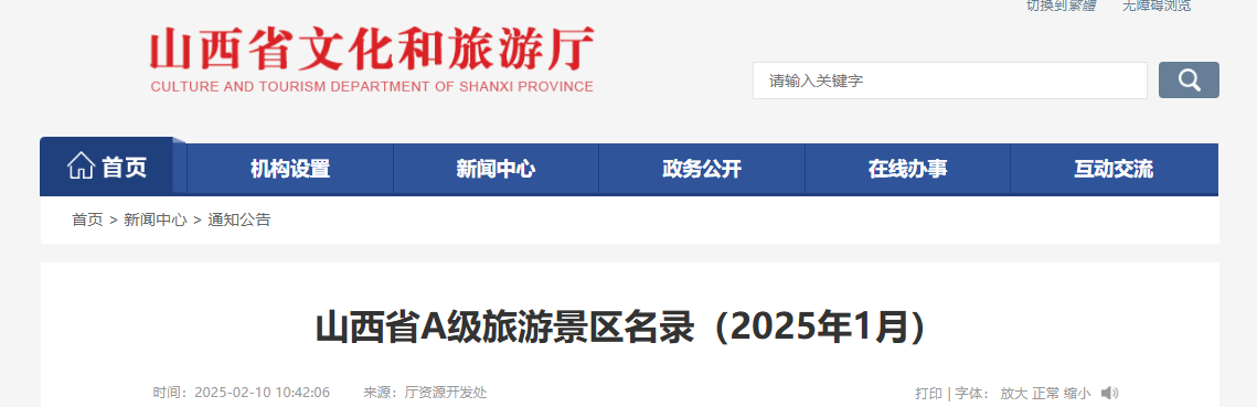 2月10日,记者从山西省文化和旅游厅官方网站获悉,文旅厅公布了山西省A级旅游景区名录(截至2025年1月)。