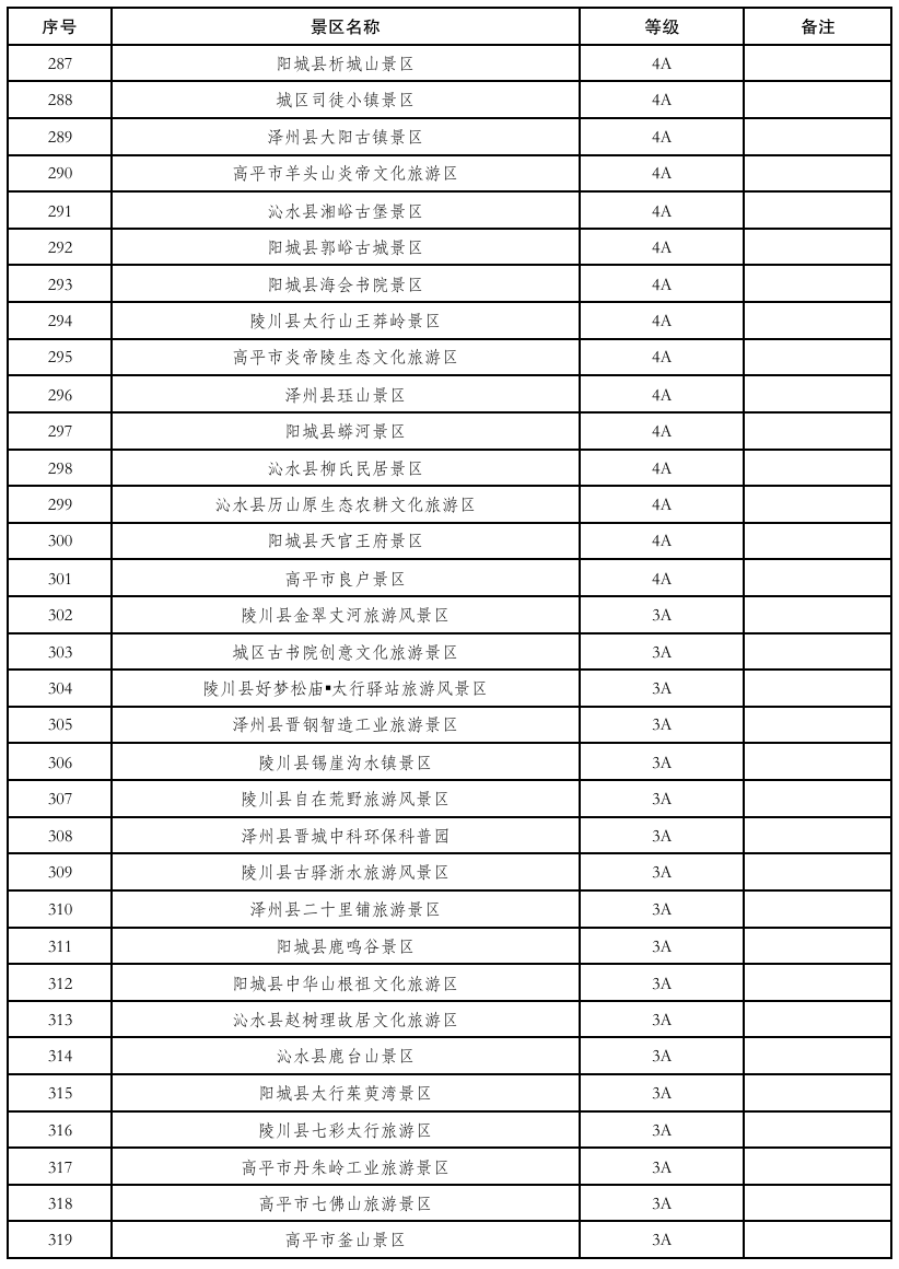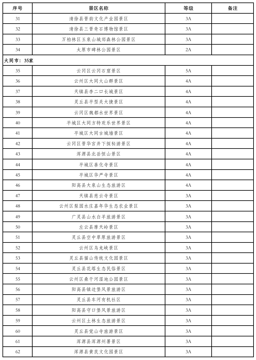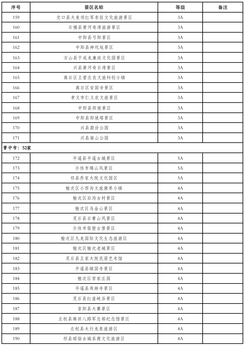 其中,太原市有A级景区34家,晋祠天龙山景区为5A级;大同市有A级景区35家,云冈区云冈石窟景区为5A级;朔州市有A级景区8家;忻州市有A级景区51家,五台山风景区和代县雁门关景区为5A级;吕梁市有A级景区43家;晋中市有A级景区52家,平遥县平遥古城景区、介休市绵山景区和祁县乔家大院文化园区为5A级;阳泉市有A级景区23家;长治市有A级景区39家,壶关县太行山大峡谷八泉峡景区为5A级;晋城市有A级景区64家,阳城县皇城相府生态文化旅游区为5A级;临汾市有A级景区50家,洪洞大槐树寻根祭祖园景区、乡宁县云丘山景区和黄河壶口瀑布旅游区为5A级;运城市有A级景区52家。