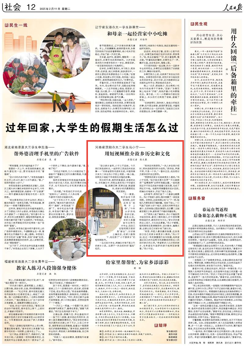 “我想,年轻人最自豪的浪漫,应该是助力自己的家乡被更多人熟知。”冯小宁说,经过一年的寒暑假行走与拍摄,他希望通过自己的作品帮手机屏幕前的陌生人找到对家乡的认同。“希望更多人认识我的家乡,也希望在外追梦的游子能常回家看看。”冯小宁说。