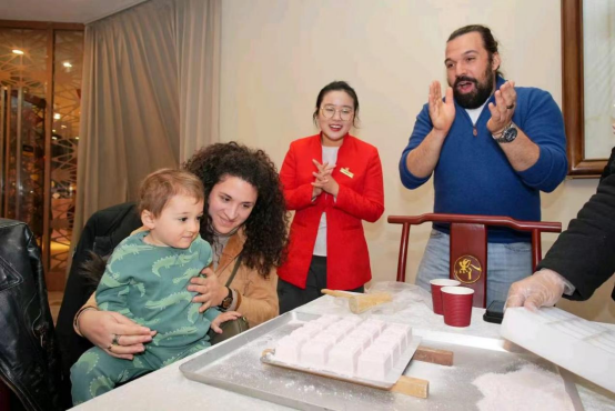 同一天,在金桥碧云社区,“蒸蒸日上 ‘糕’兴过年”中外居民迎元宵活动也喜乐开场。30多名中外居民跟着指导老师,用木锤敲打模具,制作了一块块“刻”有各种花纹、文字图案的方形糕点——“恋棠焋糕”。