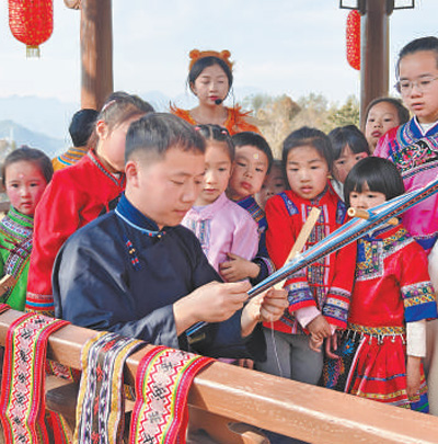 浙江云和县黄处村,非遗代表性传承人正在向孩子们展示非遗技艺。 |
