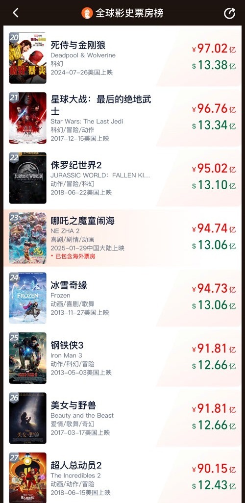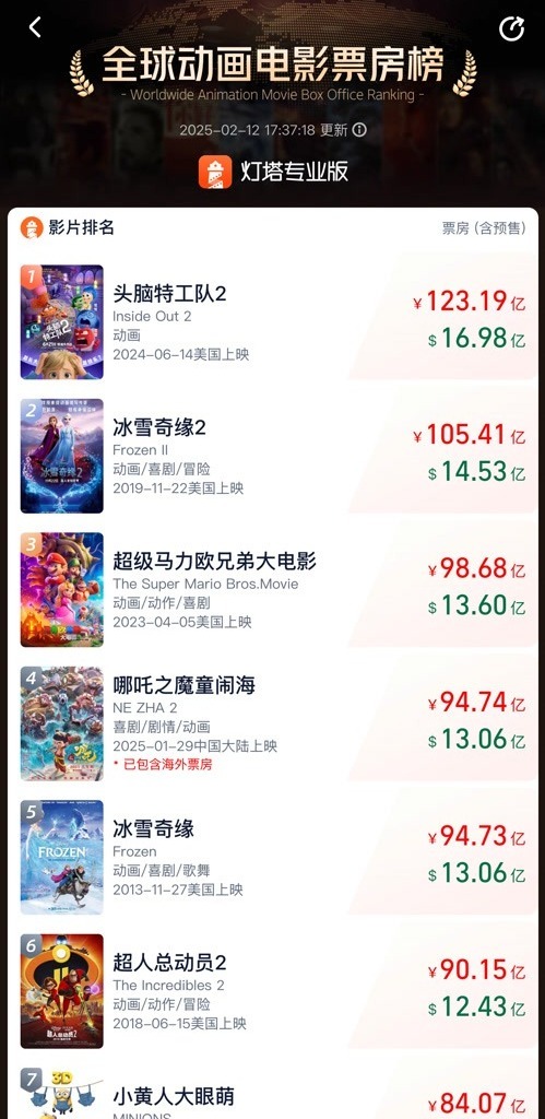 《哪吒2》升至全球动画电影票房榜第四名