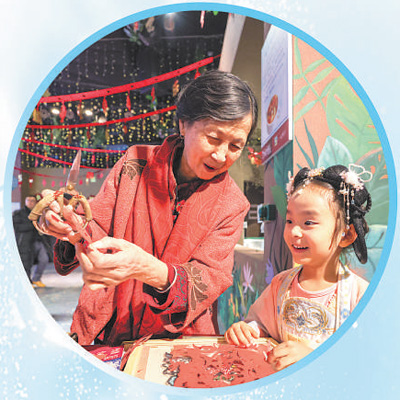 非遗文化展示区,来自河南的吴豫琳小朋友两手托腮,认真观看黑龙江省级非遗代表性传承人施丽华制作剪纸。“今年是蛇年,我就剪一条小蛇送给你吧!”施丽华笑着对吴豫琳说。剪刀开合,彩纸在施丽华手中快速翻转,一条栩栩如生的“小蛇”很快出现在眼前。“谢谢奶奶,祝您元宵节快乐!”吴豫琳接过剪纸,甜甜地回应。