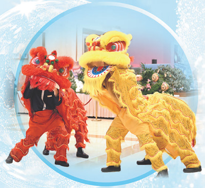 2月12日,亚布力山地媒体中心的舞狮表演。 |