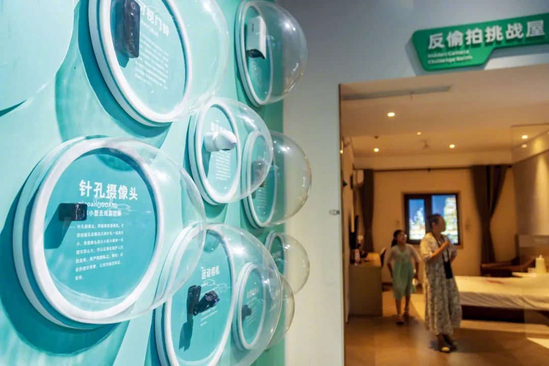 河南郑州网络安全科技馆内的“反偷拍挑战屋”,人们在模拟的酒店内寻找针孔摄像头。图/视觉中国