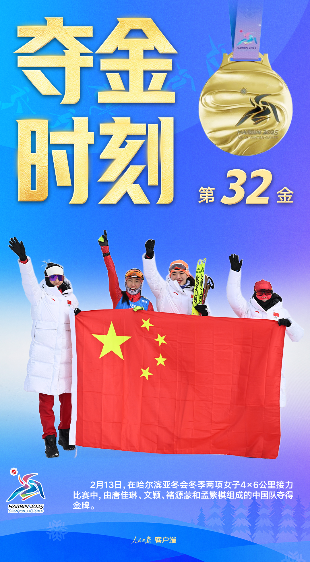 2月13日,在哈尔滨亚冬会冬季两项女子4×6公里接力比赛中,由唐佳琳、文颖、褚源蒙和孟繁棋组成的中国队夺得金牌。