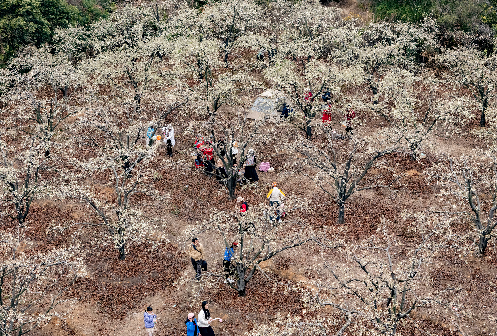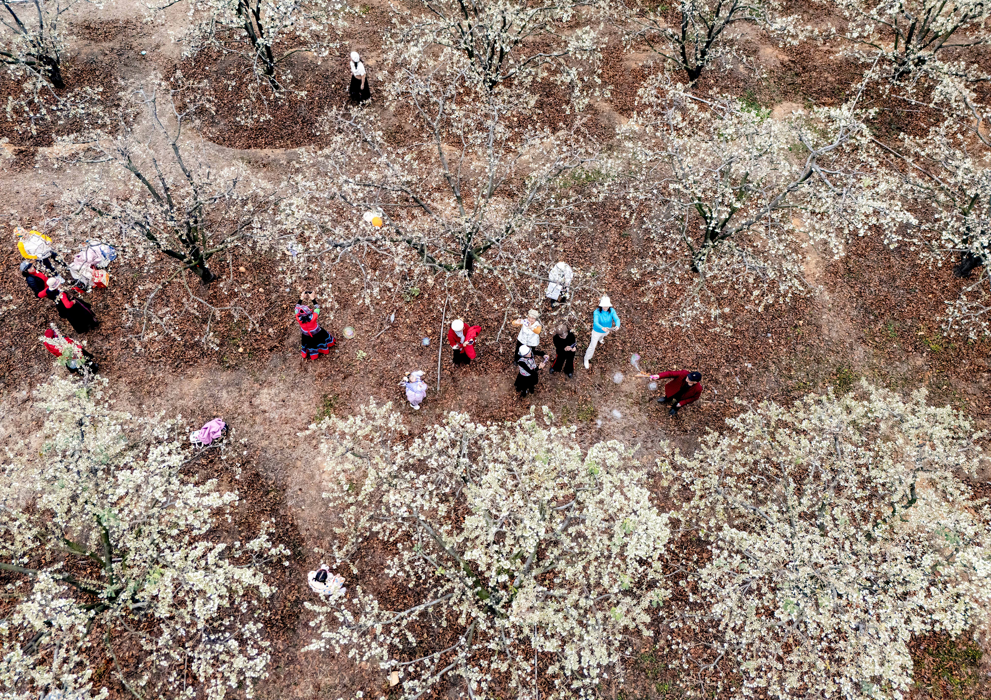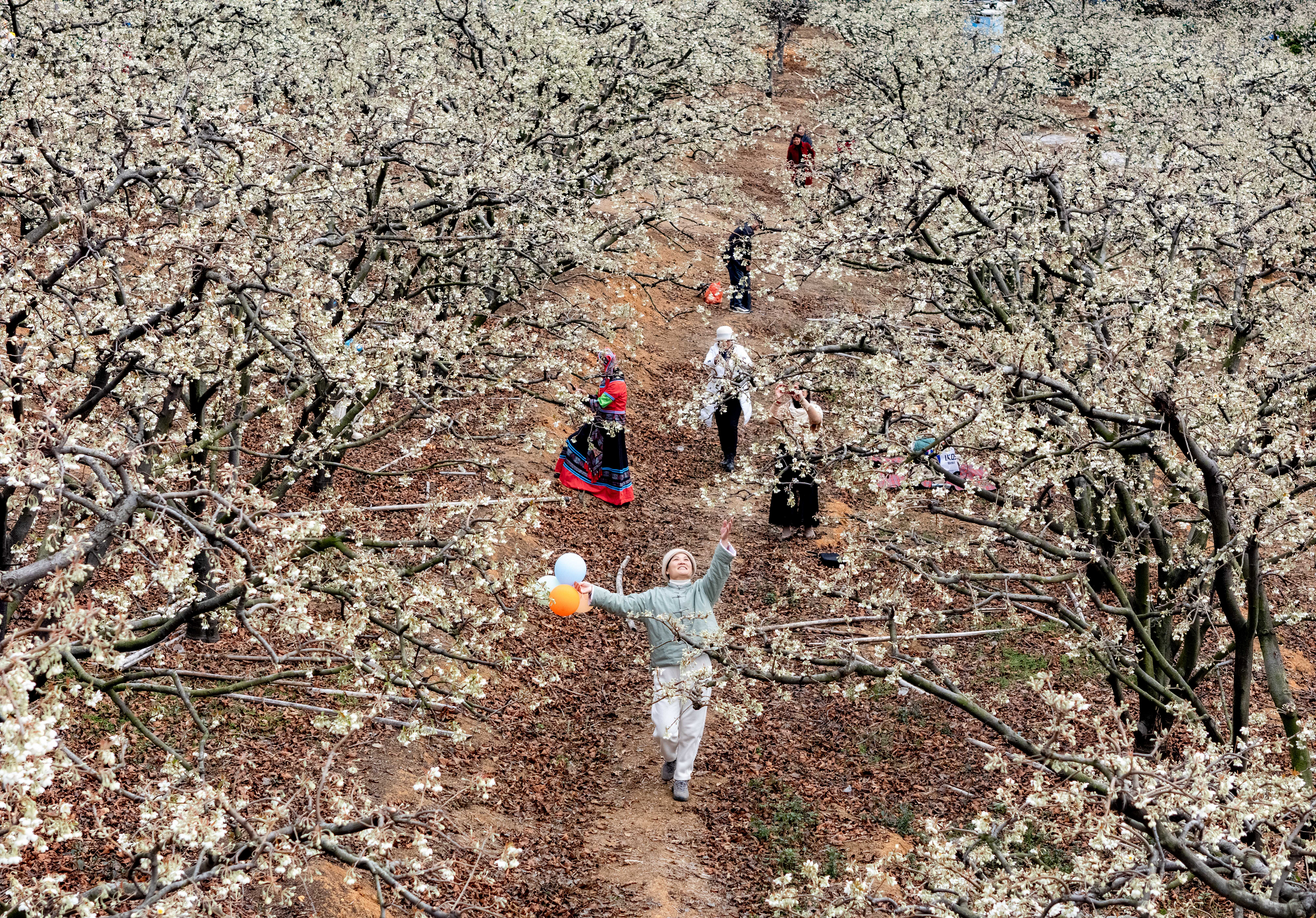 日前,记者在广西贺州市八步区莲塘镇美仪村看到,连片的山楂花竞相绽放,洁白如雪的花瓣铺满枝头,美不胜收。市民游客纷至沓来,漫步在花海间,感受早春气息。 图为游客在赏花拍照。黎豪图摄