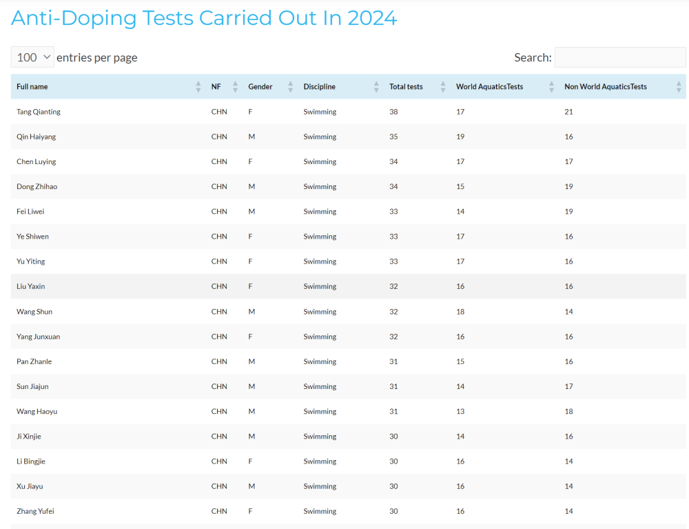 世界泳联2024兴奋剂检测:接受检测最多的前32位全是中国选手