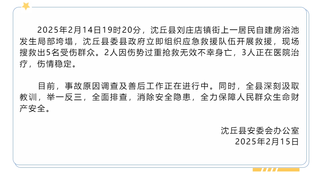据沈丘县安委会办公室消息,2025年2月14日19时20分,河南沈丘县刘庄店镇街上一居民自建房浴池发生局部垮塌,当地组织应急救援队伍开展救援,现场搜救出5名受伤群众。2人因伤势过重抢救无效不幸身亡,3人正在医院治疗,伤情稳定。
