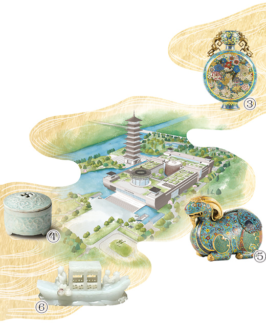 图③:展陈清掐丝珐琅花蝶纹抱月瓶。图④:展陈宋青白釉万字纹香薰。图⑤:展陈清“乾隆年制”款掐丝珐琅缠枝花卉鎏金羊形尊。图⑥:展陈清青白玉渔家乐船形摆件。图③至图⑥均为扬州中国大运河博物馆提供