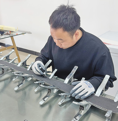 冰雪欢腾体育装备科技(哈尔滨)有限公司内,工人为滑雪板底面边刃涂胶加固。 秦文豹摄(人民视觉)