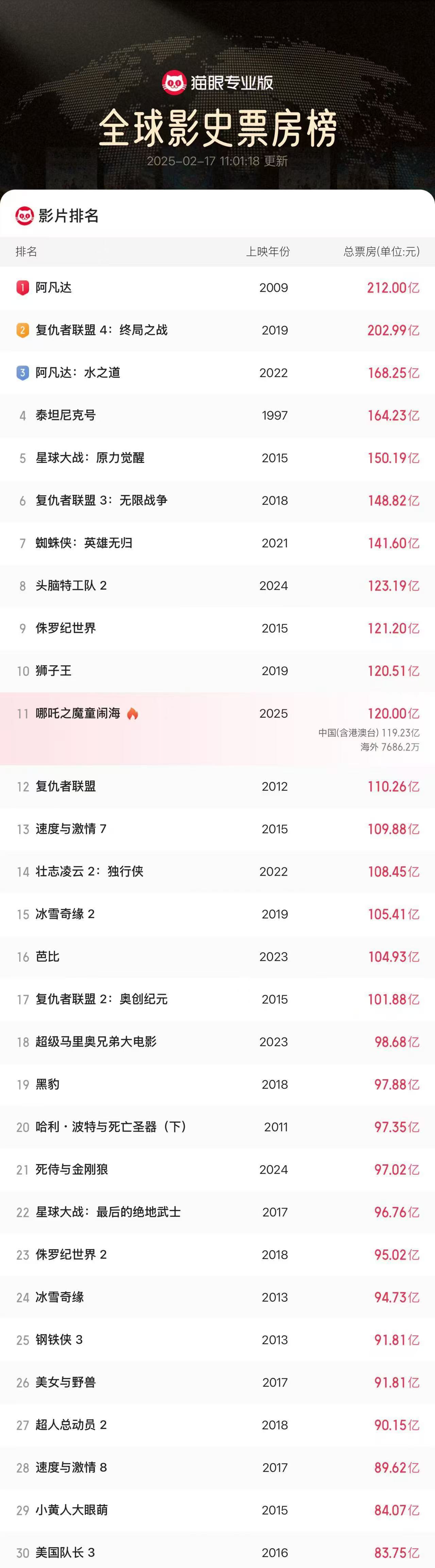 据猫眼专业版数据,电影《哪吒之魔童闹海》累计票房(含预售及海外票房)突破120亿!暂列全球票房榜第11位。