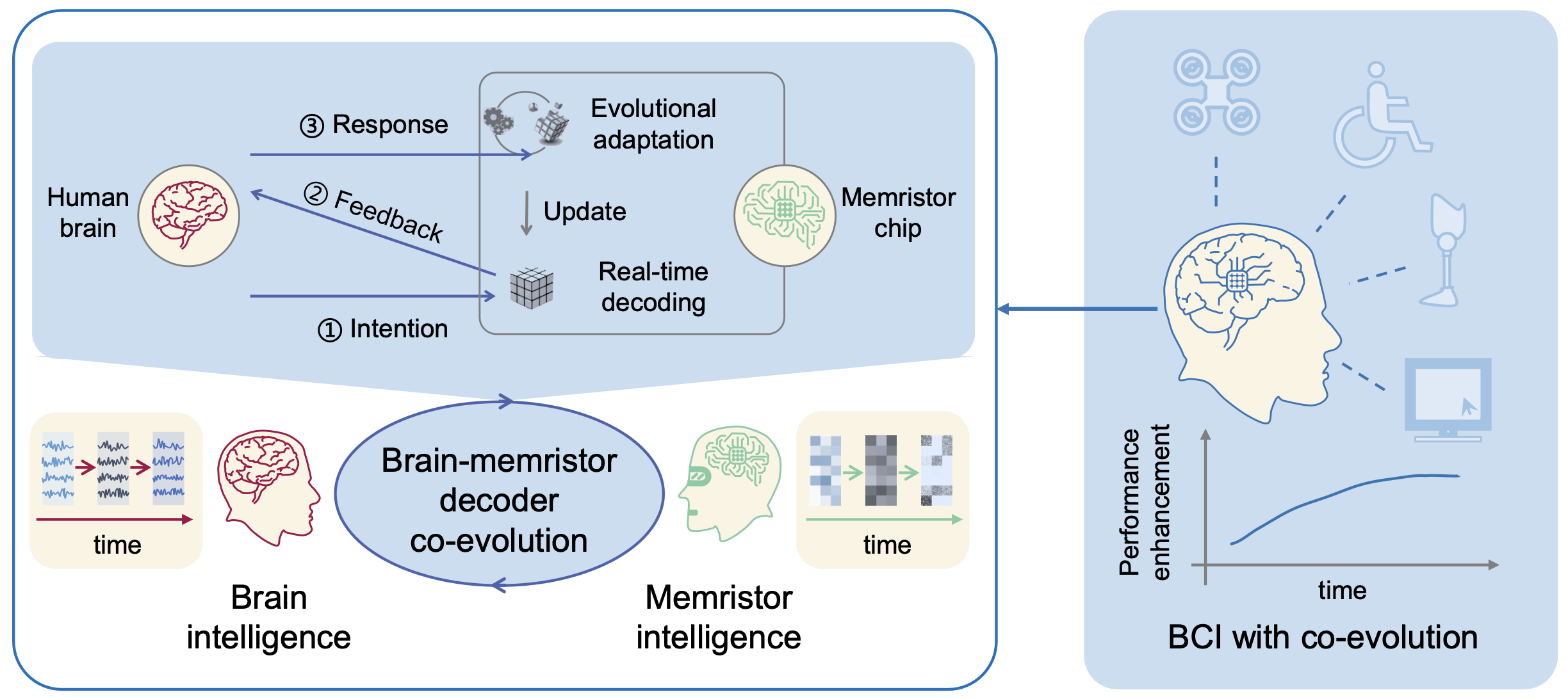 天津大学与清华大学研究团队发现,脑电信号中的非平稳特性不仅来源于传统观点认为的背景脑电变异,而且与闭环脑机交互引导下的任务脑电演变密切相关。基于这一发现,团队首次提出了“双环路脑机协同演进框架”,并通过忆阻器神经形态器件构建了全新的脑机接口系统。在双环路框架下,“机学习”环路中的忆阻器解码器通过适应脑电信号波动完成解码参数更新,“脑学习”环路中的任务相关脑电特征在“决策-反馈”循环的引导下不断正向演化。相关算法基于128kb规模的忆阻器神经形态器件实现了硬件化部署,将脑电信号的多步计算过程优化为单步计算。相比于传统纯数字硬件方案,忆阻器新方案的归一化解码速度提高了2个数量级(百倍)以上,能耗降低了3个数量级(千分之一)以下,高效支撑了四自由度脑控无人机任务目标的成功实现。在连续6小时的长时程脑机交互实验中,大脑和解码器的贡献比例呈现动态变化,展现出了脑机协同演进的过程:初期以解码器自适应更新为主,随着时间推移,大脑贡献逐步增加,最终脑机接口性能不仅没有下降,还实现了约20%的准确率提升。