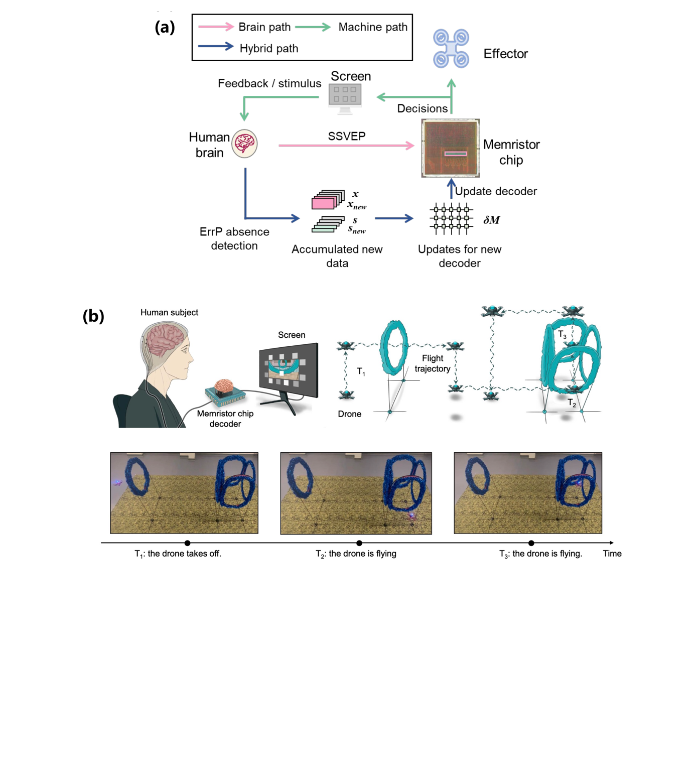图2 (a)脑-忆阻器交互式更新框架;(b)基于忆阻器脑电解码的实时脑控无人机飞行
