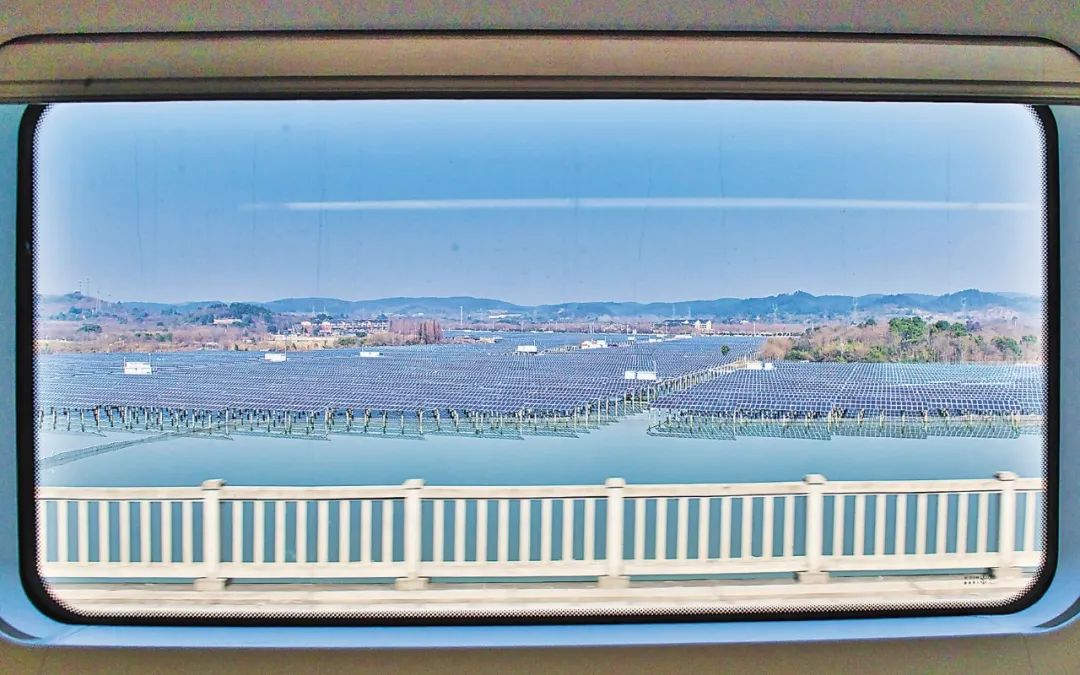 我是浙江安吉人,乘坐G7500次列车,从杭州东站出发回家。当列车快到安吉时,窗外出现一片水域,只见一排排蓝色的光伏发电板立于水中,在阳光下熠熠生辉。