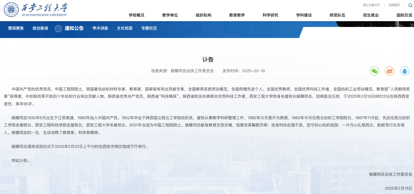 2月19日,西安工程大学网站发布讣告,中国共产党的优秀党员,中国工程院院士,我国著名纺织材料专家、教育家姚穆同志,因病医治无效,于2月19日在西安逝世,享年95岁。姚穆同志献身教育无怨无悔,锐意改革鞠躬尽瘁;投身科技自强不息,坚守初心纺织报国;一片丹心扎根西北,躬耕笃行矢志育人。姚穆同志的一生,生动诠释了教育家、科学家精神。