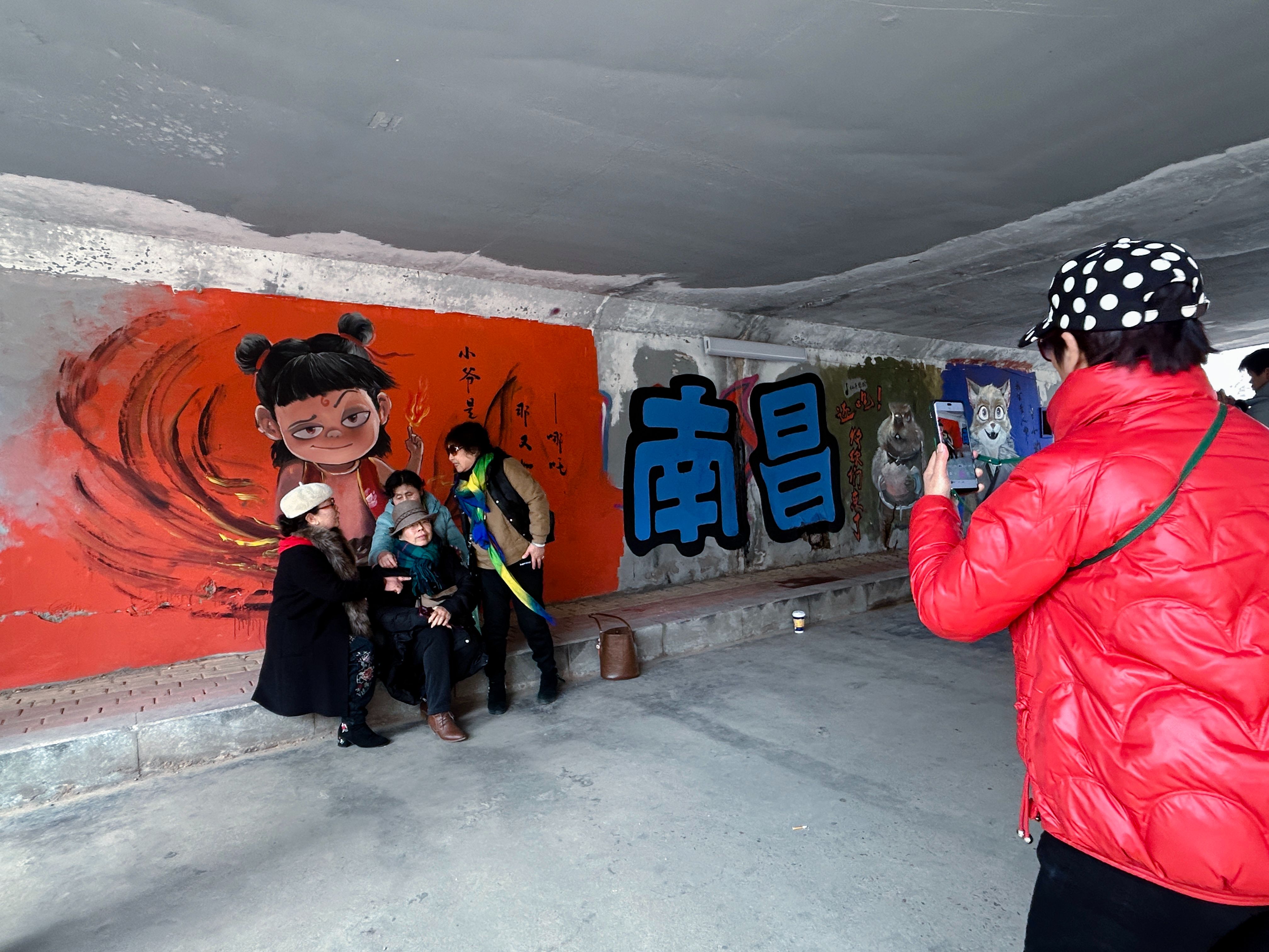 原本平平无奇的涵洞墙壁,如今被色彩斑斓的涂鸦覆盖。“这次墙体绘画能够受到大家的喜爱,我感到很开心。”已经从学校毕业五年的赵永臻谈及这次公益性创作,心中甚是欣慰。他说,“我一直很喜欢绘画,在南昌大学学习时,我遇到了很多优秀的老师。我的专业老师金晓明一直鼓励我,坚持兴趣爱好,学好专业知识。老师们的话让我一直坚持所爱。这些年,我一直不停地画,不停地学习,这次的哪吒系列人物反响如此之好让我也更加自信了。”