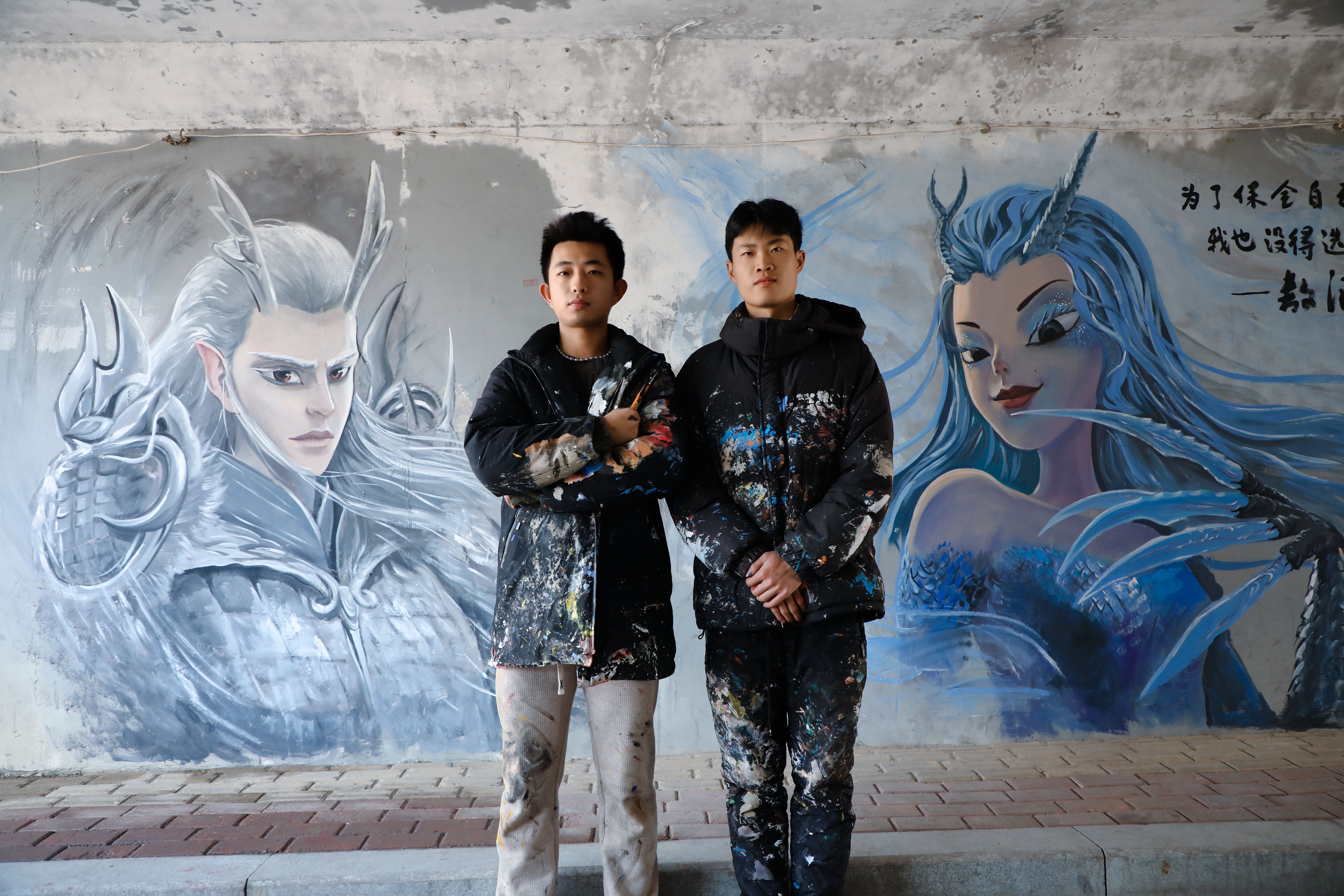 赵永臻(左)创作的公益墙画 欧阳仟 摄影