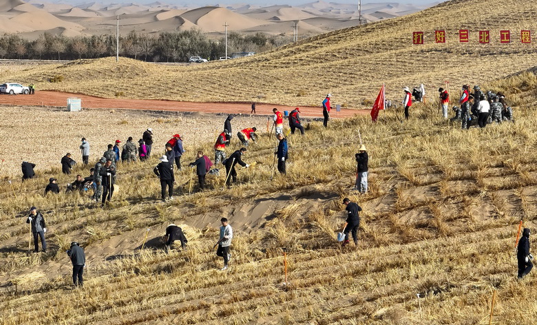 西沙窝沙漠总面积23.5万亩,是全县最大的风沙策源地。干部群众多年义务压沙,如今连绵沙丘上,草方格如阵列般渐次铺展,宛如金黄色大网牢牢锁住肆虐的风沙。