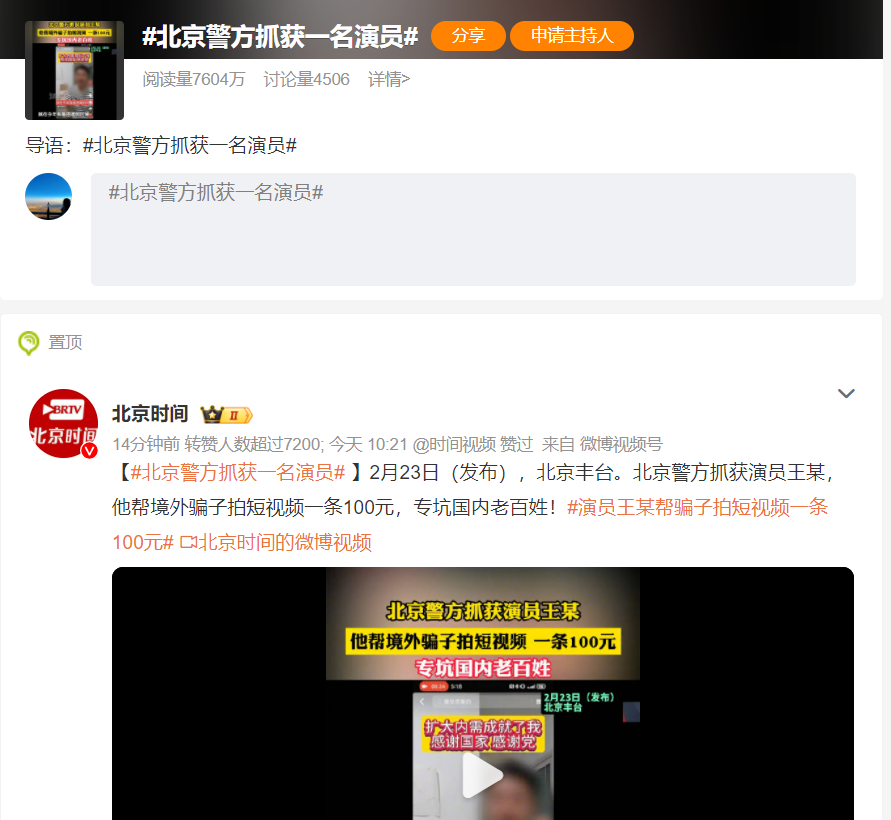 近日,北京警方抓获演员王某,他帮境外骗子拍短视频一条100元,专坑国内老百姓。2月25日,相关话题登上热搜榜,引发关注。