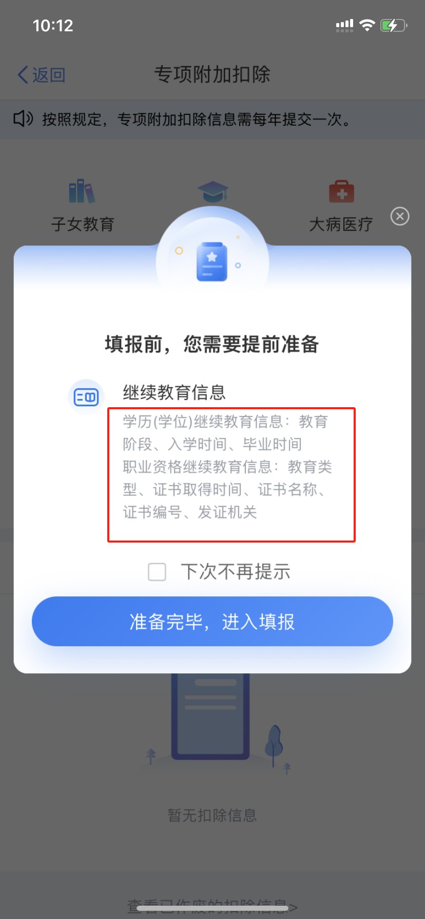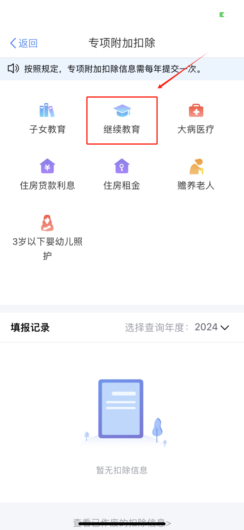 第二步,在专项附加扣除页面,点击“继续教育”。