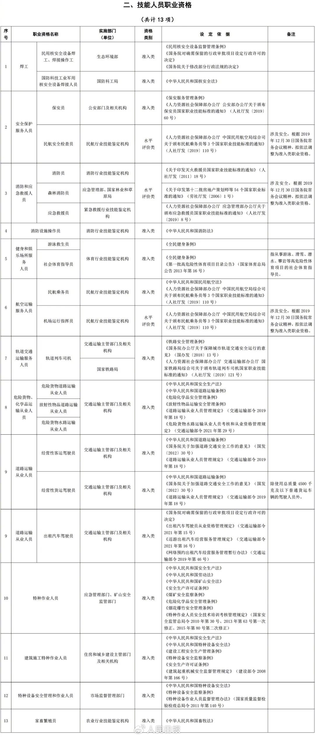 技能人员职业资格13项