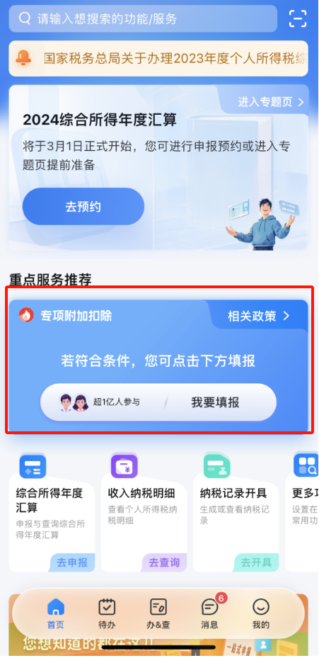 第一步,打开个税App,在首页专项附加扣除处点击“我要填报”。