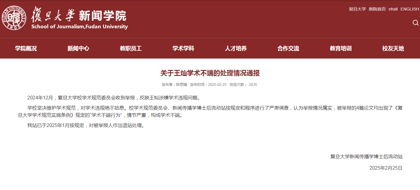 通报指出,学校坚决维护学术规范,对学术违规绝不姑息。校学术规范委员会、新闻传播学博士后流动站按规定和程序进行了严肃调查,认为举报情况属实,被举报的4篇论文均出现了《复旦大学学术规范实施条例》规定的“学术不端行为”,情节严重,构成学术不端。