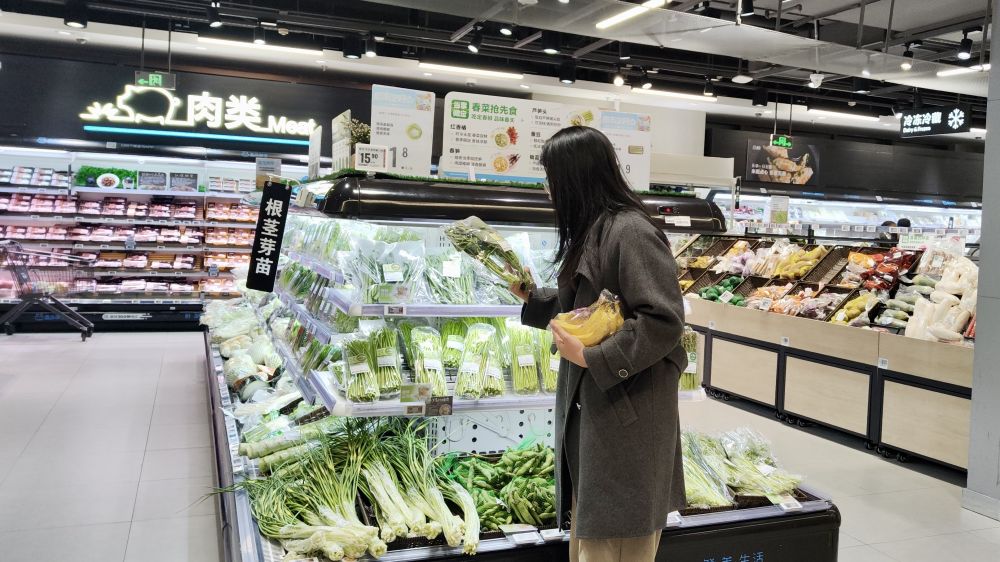 2月21日,消费者在武汉市盒马鲜生岳家嘴店内选购板蓝根青菜。新华社记者 熊翔鹤 摄