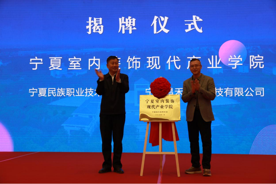 宁夏民族职业技术学院党委副书记、院长焦玉柱与宁夏昌禾同盛科技有限公司董事长闫生昌共同为“宁夏室内装饰现代产业学院”揭牌。