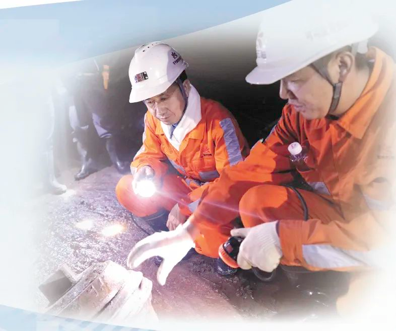 范京道(左)在可可盖煤矿井下研究掘进设备应用与改进。受访者供图