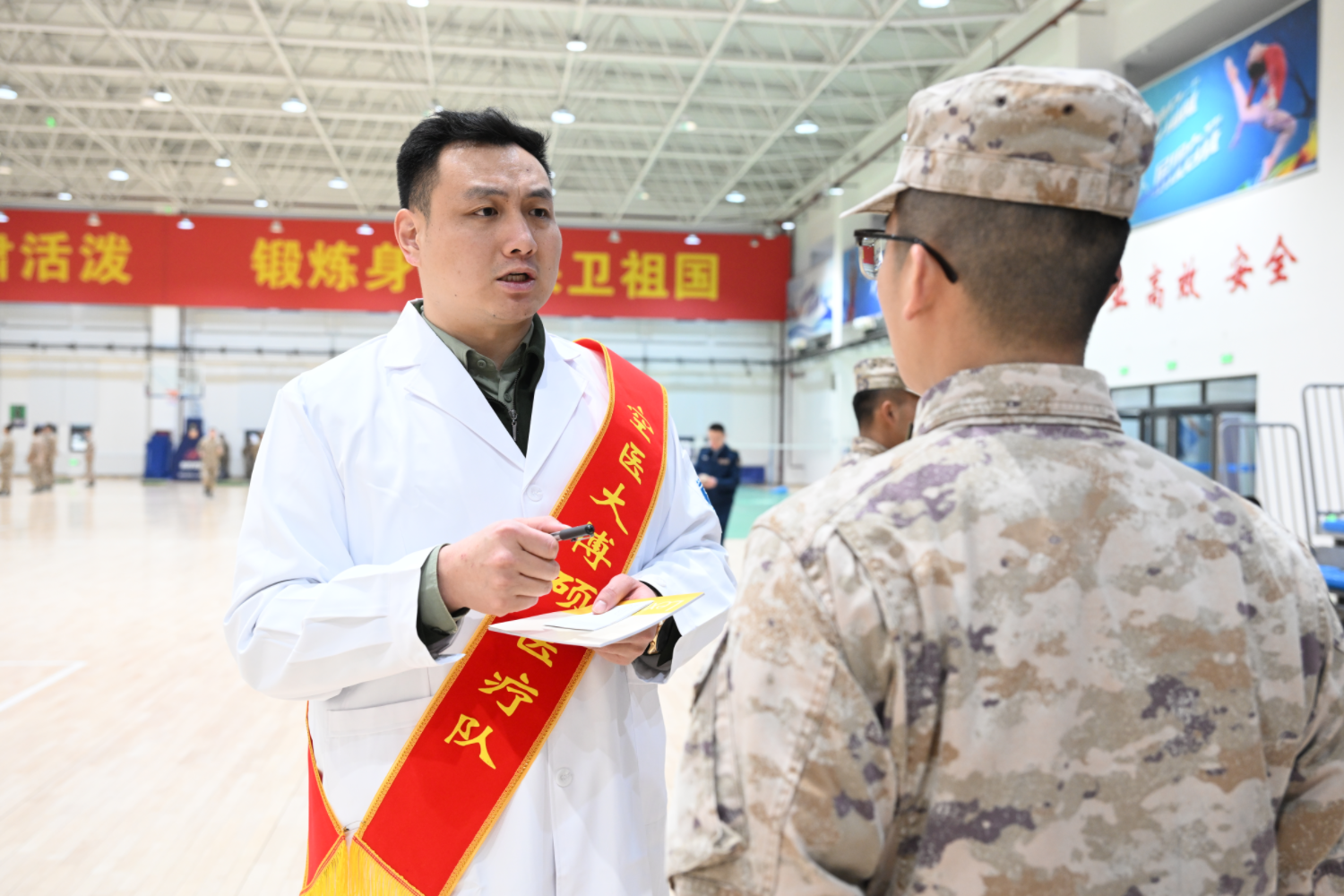 在三五学雷锋“百名博士硕士巡诊服务”活动中,骨科博士生邱海洋正在训练伤防护科普讲座上给官兵们答疑解惑。