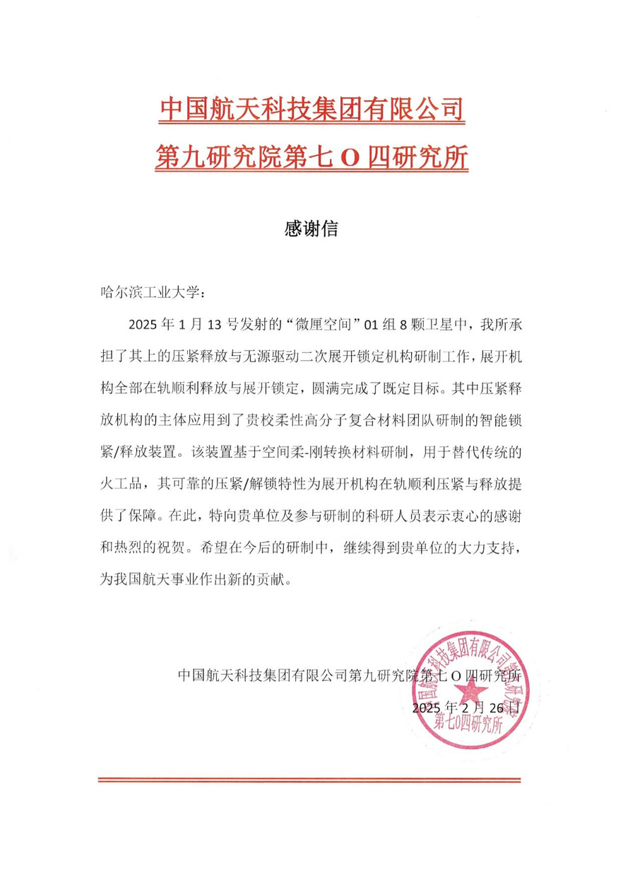 近日,中国航天科技集团有限公司第九研究院第七〇四研究所向我校发来感谢信,感谢化工与化学学院柔性高分子复合材料团队研制的智能锁紧/释放装置助力“微厘空间卫星系统”首批组网卫星发射,为卫星天线的在轨可靠收纳展开提供了关键技术支撑,标志着我国在空间柔-刚转换材料基础研究及工程应用领域实现了从实验到实际应用的跨越。