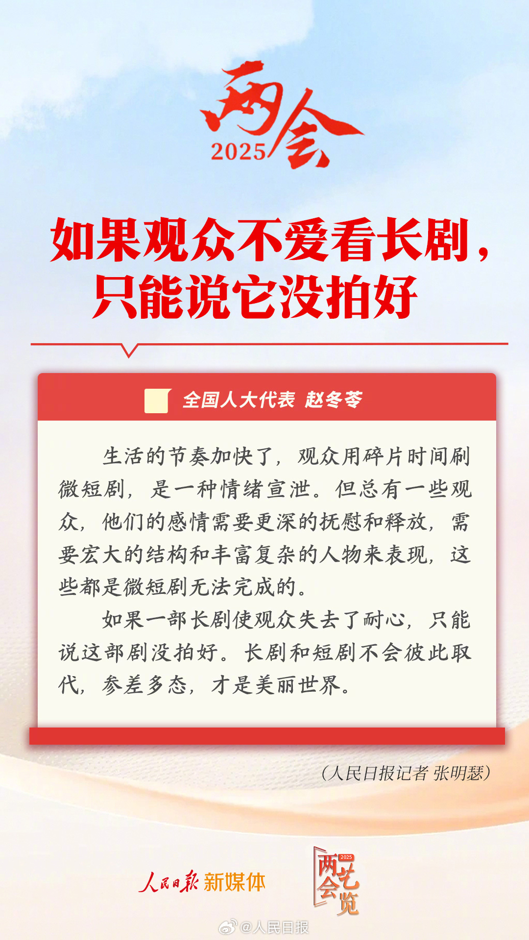 全国人大代表赵冬苓:如果观众不爱看长剧只能说它没拍好。观众用碎片时间刷微短剧,是一种情绪宣泄。但总有一些观众,他们的感情需要更深的抚慰和释放,这些是微短剧无法完成的。长剧和短剧不会彼此取代,如果一部长剧使观众失去耐心,只能说这部剧没拍好。