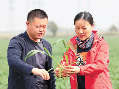 2023年4月,全国人大代表、江苏镇江永兴农机机械化专业合作社理事长魏巧(右)查看作物长势。魏巧返乡创业种植水稻,通过数字化管理,带动当地农民增收致富。