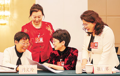 3月7日,十四届全国人大三次会议山东代表团在驻地召开小组会议。图为女代表们在热烈讨论。